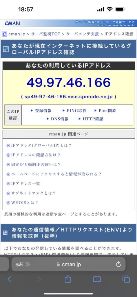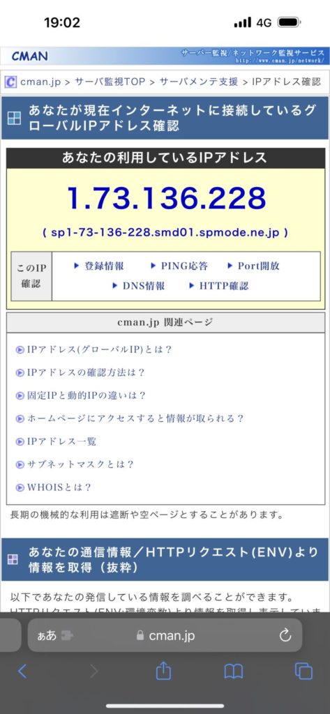 わたしはこのスクリーンショットを撮った後、機内モードONOFFをしていますから、このIPアドレスは他の方が使っているはずです。