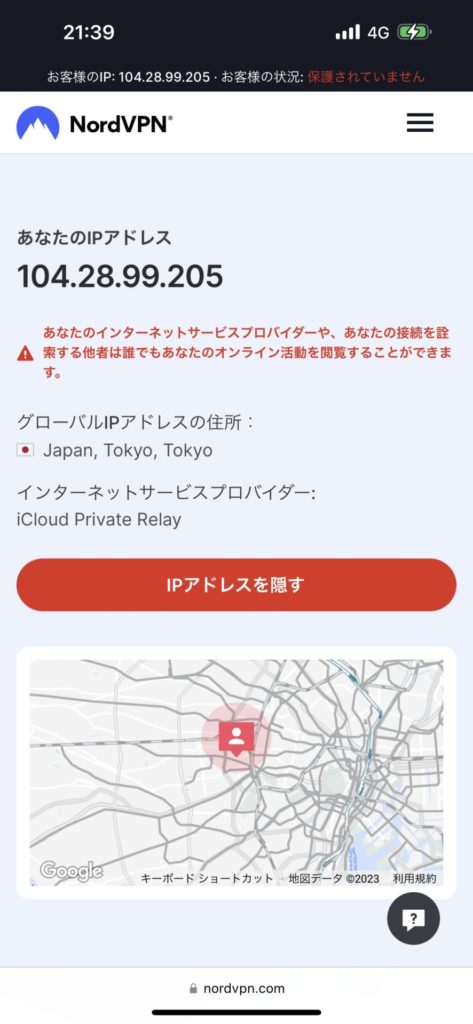 Nord VPNが出した地図位置がドコモ回線と一緒ですが、実は上のスクリーンショットは全く別資本のCATV回線でプライベートリレーをオンにしたもの。